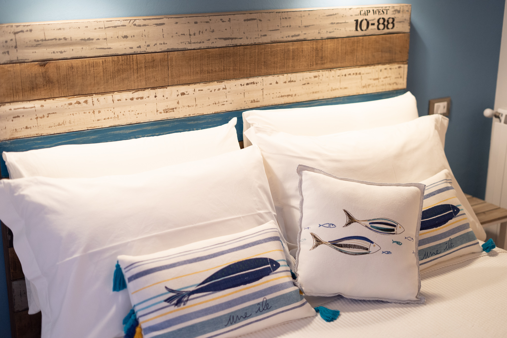 Sfumature blu, colori del mare, della sabbia, colori e profumi del nostro mare in una stanza avvolgente e riposante. Questa camera è dotata di letto alla francese.